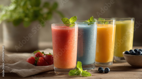refreshing summer scene featuring array of colorful fruit smoothies in various glasses