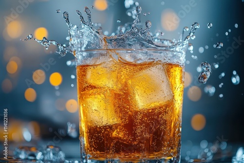 Refreshing Sweet Tea Splashing Over Ice Cubes in a Glass with Dynamic Pouring Motion