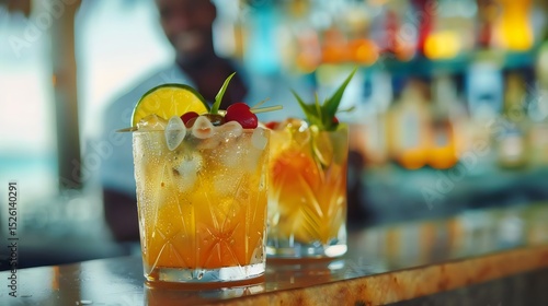 Refreshing tropical cocktails garnished with lime and cherries sit on a bar, ready to be served