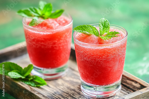 Refreshing watermelon slush drinks with mint garnish on a wooden tray, perfect for summer vibes and healthy refreshment.