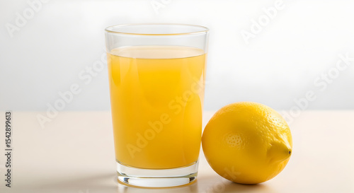 Refreshing Yellow Lemonade or Lemon Juice in a Glass Alongside a Whole Fresh Lemon on a Light Wooden Table with White Background