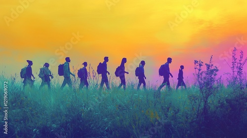Refugees and immigrants looking for a new life expectancy. Column of migrants crossing desolate lands. Silhouette. Ai generative