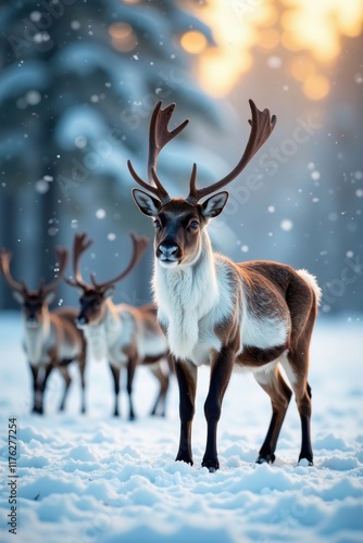 Reindeer herd standing in a snowy field surrounded by falling snowflakes , reindeer,
