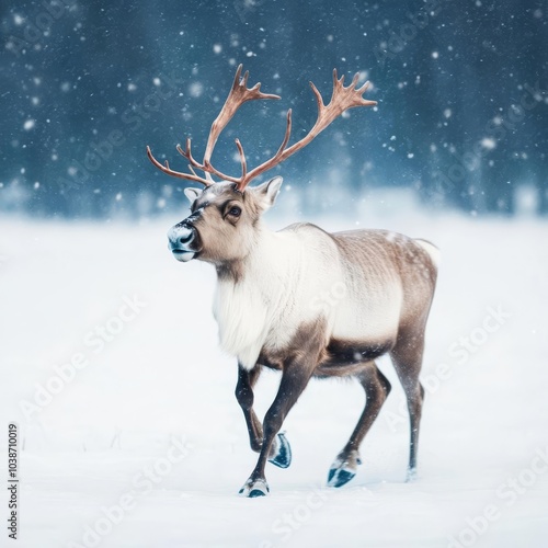 Reindeer running through a snowstorm in Lapland, powerful and majestic in motion