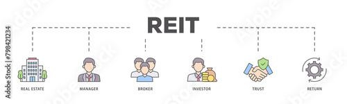 REIT icons process flow web banner illustration of real estate, manager, broker, investor, trust and return icon live stroke and easy to edit