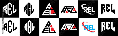 REL letter logo design in six style. REL polygon, circle, triangle, hexagon, flat and simple style with black and white color variation letter logo set in one artboard. REL minimalist and classic logo