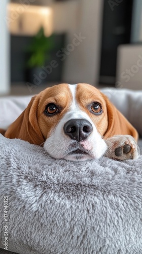 Relaxed beagle resting on a soft fluffy bed in a modern cozy home