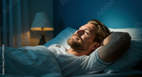 Relaxed blond man lying in bed, arms crossed behind head, eyes fixed on the ceiling.