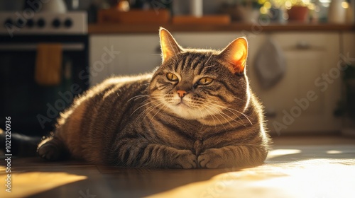 Relaxed Cat Enjoys Sunlight in Cozy Kitchen Setting
