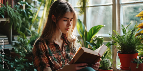Relaxed trendy young woman with reading a book in green pants in the modern living room