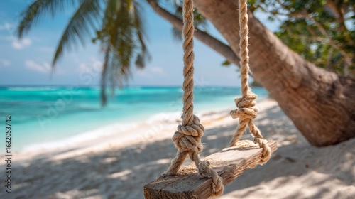 Relaxing beach swing overlooking turquoise water and sandy shore during sunny day