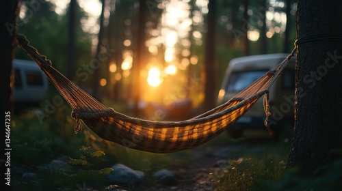 Relaxing hammock in forest at sunset