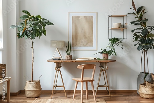 Relaxing Home Office with Empty Poster and Wooden Desk,Feminine Workspace with Pastel Tones and Empty Poster