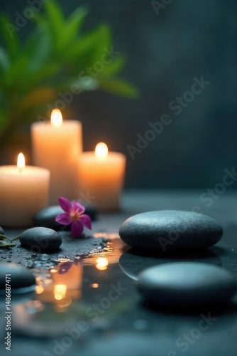 Relaxing horizontal spa scene featuring smooth stones, candles, and essential oils, promoting serenity and wellness , spa day, mindfulness