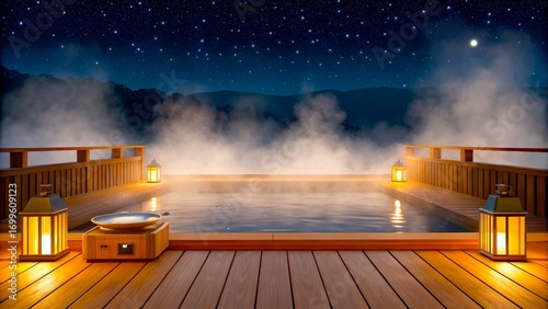 Relaxing hot spring retreat under a starry night sky in a tranquil mountain setting