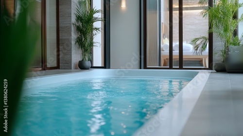 Relaxing indoor swimming pool area with natural light and lush greenery for a tranquil escape in a modern spa setting
