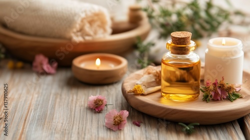 Relaxing spa arrangement with essential oils and candles for self-care