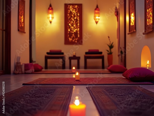 Relaxing yoga studio featuring candles, cushions, and a tranquil atmosphere for meditation and mindfulness practices.