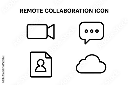 Remote collaboration line icon set. Vector symbols for virtual teamwork, online communication, and business tools. Includes video conference, chat, user document, and cloud storage.