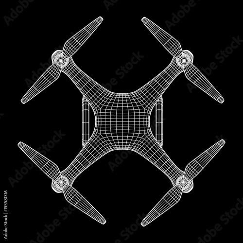 Remote control air drone. Dron flying with action video camera. Wireframe low poly mesh vector illustration
