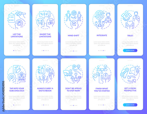 Remove barriers blue gradient onboarding mobile app screen set. Creative block walkthrough 5 steps graphic instructions with linear concepts. UI, UX, GUI template. Myriad Pro-Bold, Regular fonts used