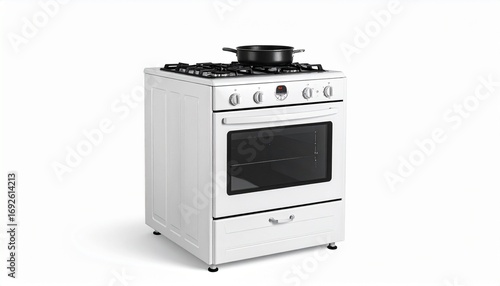 Render a white gas stove with four burners, control knobs, and oven window showing visible flames inside, isolated on white background, emphasizing fire hazard, appliance design, and dramatic tension.