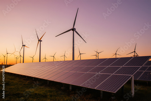 Renewable Energy Array: A breathtaking scene of sustainable progress, featuring wind turbines and solar panels against a captivating sunset sky, symbolizing a clean energy future.