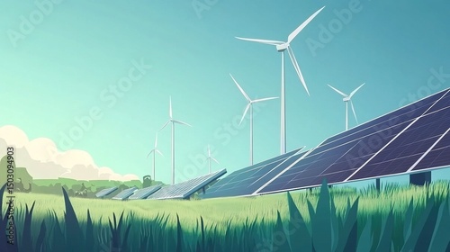 Renewable energy concept illustration of modern wind turbines and solar panels in flat design, demonstrating environmentally friendly technology for sustainable power generation.