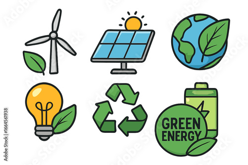 Renewable Energy Green Technology Vector Icons Set. Sustainable Power, Solar Panel, Wind Turbine, Recycling Symbol, Eco Light Bulb, Earth Environmental Conservation Cartoon Illustration