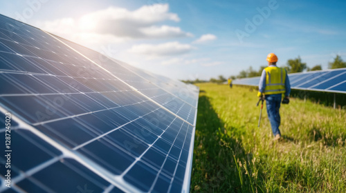 Renewable energy source with wide view of solar farm and glistering panels in sunlight