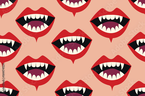 Repeated Vampire Lips Pattern with Fangs on Light Pink Background Halloween Aesthetic