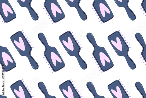 Repeating pattern featuring dark paddle brushes with pink heart design for haircare