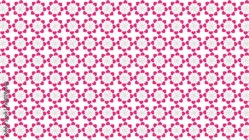 Repeating pattern of white circles with swirls surrounded by pink heart shapes on white background