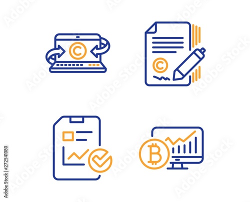 Report checklist, Copywriting notebook and Copywriting icons simple set. Bitcoin chart sign. Sales growth file, Writer laptop, Сopyright signature. Cryptocurrency statistics. Science set. Vector