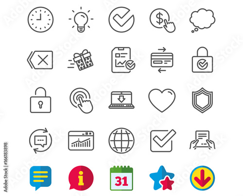 Report, Time and Globe line icons. Statistics, Speech bubble and Light bulb signs. Credit card, Download and Lock symbols. Gift delivery, Check and Protection Shield. Vector