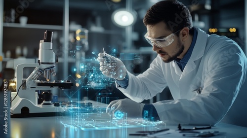 Research experiment in a laboratory scientist conducting analysis high-tech environment futuristic viewpoint innovations in science and technology