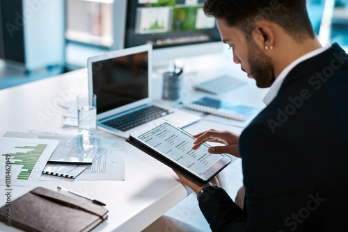 Research, tablet and man with paperwork for data analysis, metrics and stats for business growth. Charts, graphs and businessman with digital app for sales development, profit or finance in office.