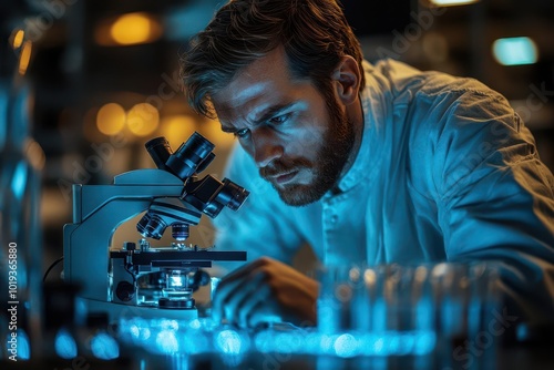 researcher intensely focused on a microscope surrounded by scientific equipment in a modern laboratory soft blue lighting creates a clean professional atmosphere