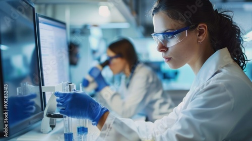 Researchers examining rice seeds using specialized equipment in the lab, recording findings on a computer.