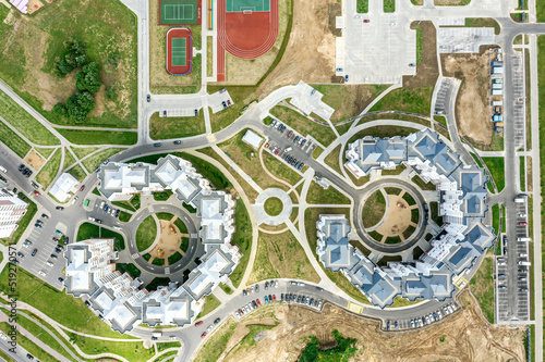 residential area with apartment buildings, parking lots, cars, playgrounds. modern urban architecture. aerial top view.