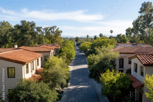 Residential neighborhood captured from above showcases lush greenery and modern architecture in a peaceful suburban setting