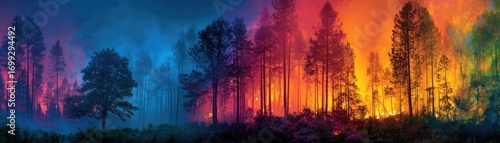 Resilience unearthed through cycle of climate change concept. A vibrant forest backdrop engulfed in colorful flames and smoke.