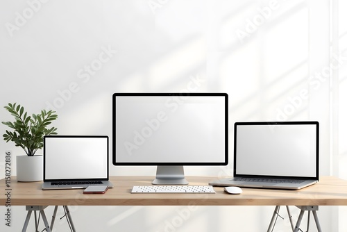 Responsive design device mokup. Laptop, computer screen, mobile phone and tablet with screen isolated on work desk