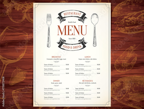 Restaurant menu design. Vector menu brochure template for cafe, coffee house, restaurant, bar. Food and drinks logotype symbol design. With a sketch pictures
