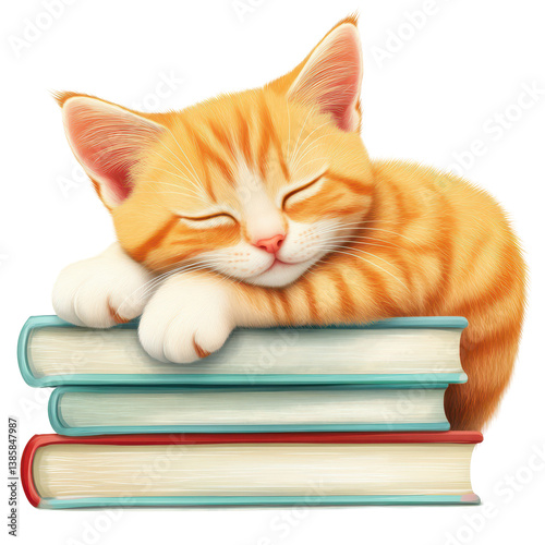 Resting Kitten and Books: A charming depiction of a sweet, ginger kitten taking a peaceful nap atop a stack of colorful books. Capturing the serene and cozy atmosphere of reading.