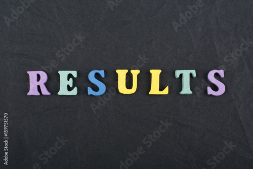 RESULTS word on black board background composed from colorful abc alphabet block wooden letters, copy space for ad text. Learning english concept.