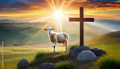 resurrection of jesus christ concept god lamb in front of the cross of jesus christ on sunrise background generative ai