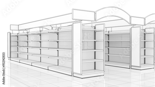 Retail empty shelving mockup with toppers and advertising aisle arches displays. 3d illustration