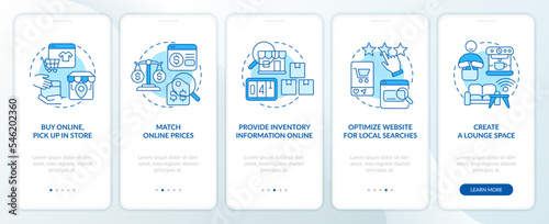 Retail marketing strategy blue onboarding mobile app screen. Walkthrough 5 steps editable graphic instructions with linear concepts. UI, UX, GUI template. Myriad Pro-Bold, Regular fonts used