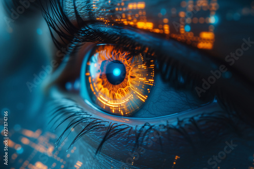 Retina scan technology. Biometric technology for personal data identity. Female eye macro photo with digital abstract infographics.